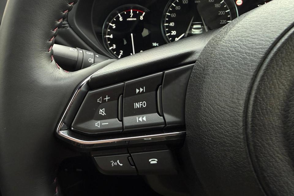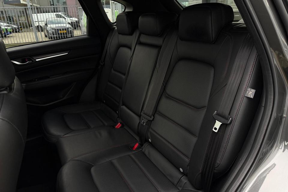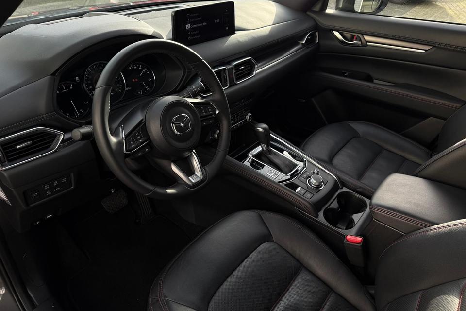 Binnenin word je verwelkomd door een rijk uitgeruste cabine met premium lederen bekleding, BOSE-audiosysteem, navigatie, Apple CarPlay/Android Auto en tal van comfort- en veiligheidssystemen. Met o.a. adaptieve cruise control, Blind Spot Monitoring, achteruitrijcamera en een elektrische achterklep biedt deze CX-5 zowel veiligheid als gebruiksgemak op topniveau.